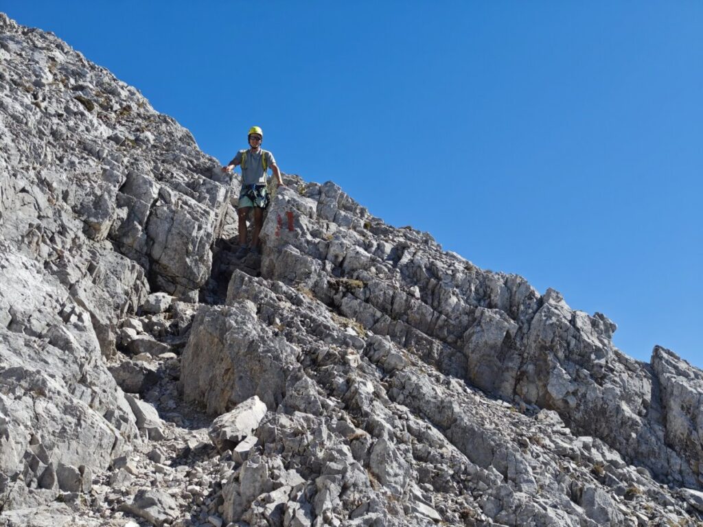 Der weitere Weg Richtung Lamsenspitze führt nun auf der Südseite hinauf. Dieser führt durch den Schutt um die Lamsenspitze herum. Rund 20 Gehminuten von hier ist der Einstieg zum Klettersteig auf den Gipfel der Lamsenspitze erreicht. Hier ist durch die große Menge an Klettersteiggehern mit Steinschlag zu rechnen. Also den Helm hier unbedingt aufsetzen. Es wird nun anspruchsvoller gegenüber dem Normalweg bis zur Lamsenscharte. Der Klettersteig auf den Gipfel hat die Schwierigkeit A/B bis B. Hier auf der Karte habe ich dir den „Normalweg“ eingezeichnet. Bis zum Eintsieg des Klettersteigs sind es 270 hm. Dafür brauchst du etwa eine dreiviertel Stunde. Der Klettersteig selbst hat ca. 300 hm und ist 900 Meter lang. Der obere Aufstieg auf den Gipfel erfolgt frei im Gelände, ohne Klettersteigseil. Hier solltest du sicher im alpinen Gelände gehen können. An einigen Stellen machen die kleinen Kalksteine zu schaffe – typisch für das Karwendel.