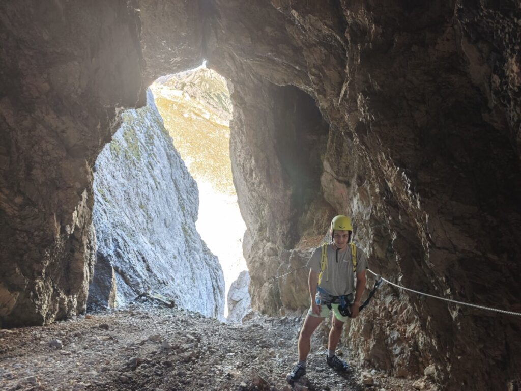 Die beiden Routen zum Gipfel bieten für unterschiedliche Ansprüche die richtige Herausforderung. Der Normalweg, ein gut gesicherter Klettersteig (A/B bis B), ist ideal für all jene, die eine genussvollere Bergtour suchen. Der anspruchsvollere Weg durch den Brudertunnel (bis C) ist lohnend für Klettersteigliebhaber. Für viele Klettersteiggeher ist der Tunnel eine Attraktion – für mich war es eher die Route durch die Felswand. Ich konnte mir nicht vorstellen, wie man diese Wand Dank des Brudertunnel Klettersteigs relativ leicht nach oben kommt. Für den Brudertunnel brauchst du keine Stirnlampe oder Taschenlampe. Es ist nur ein kurzer Abschnitt durch den Felsen, der genügend Licht von außen bekommt.